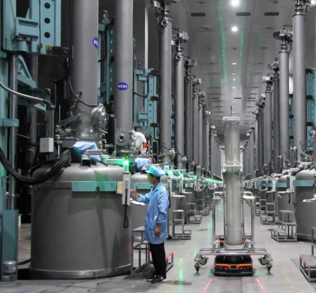 工人正在拉晶车间作业。