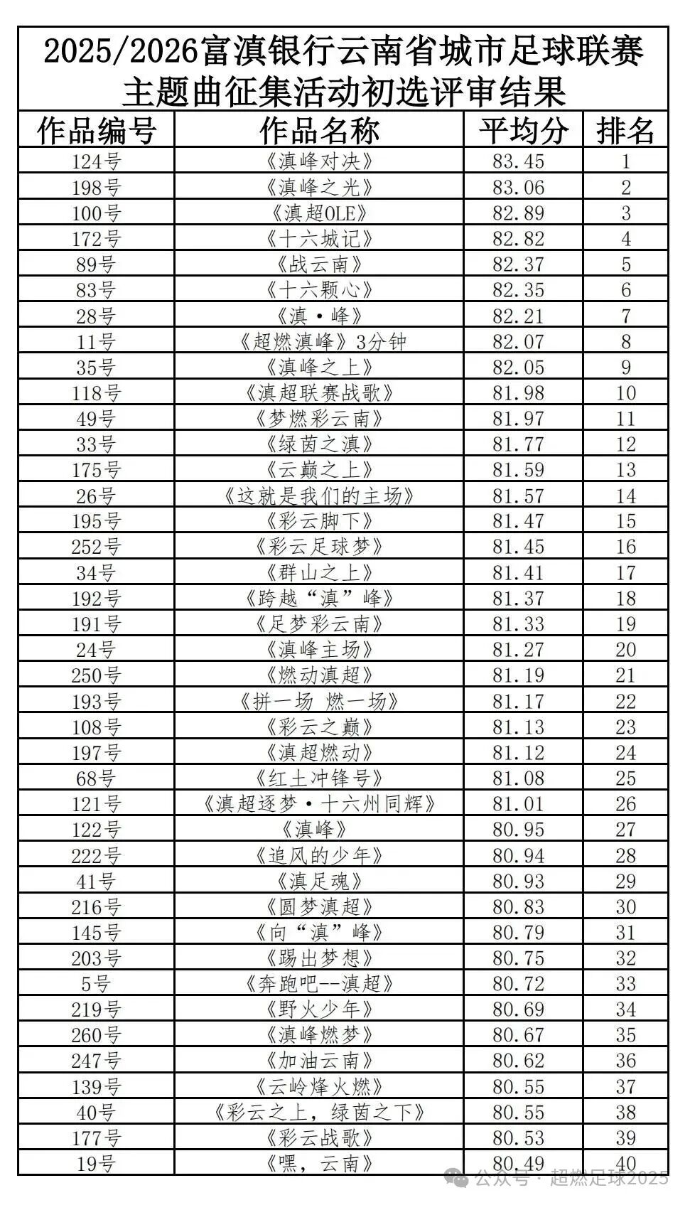 本次初评严格围绕与滇超联赛的主题契合度、作品的艺术表现力、云南元素融合创新、传唱度与感染力四大核心维度。