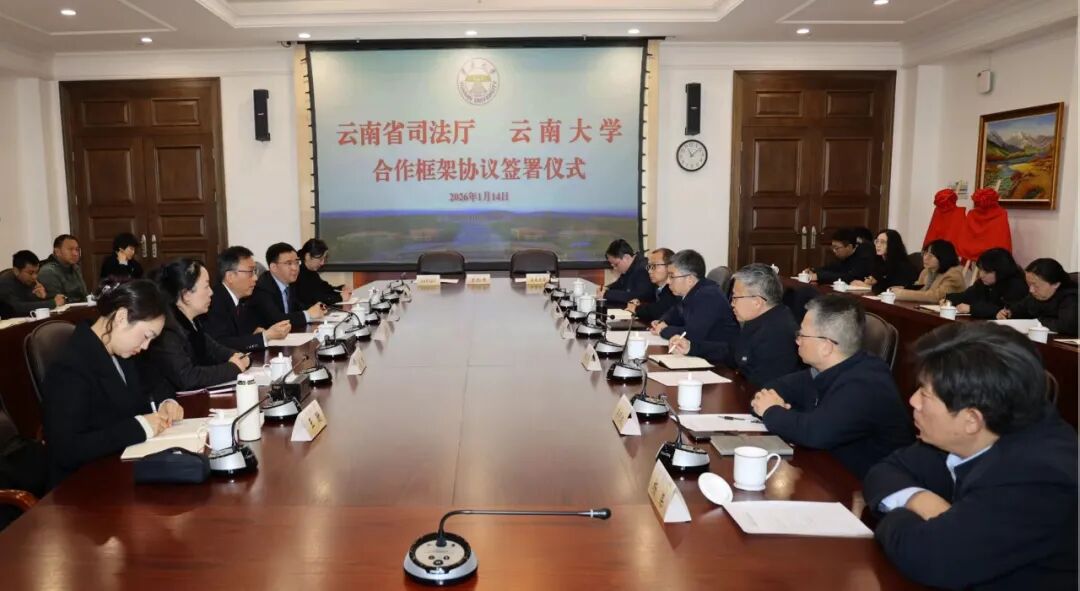 2026年1月14日,云南省司法厅与云南大学合作框架协议签约仪式暨行政复议理论研究中心、法学教学实践基地揭牌仪式在云南大学隆重举行。