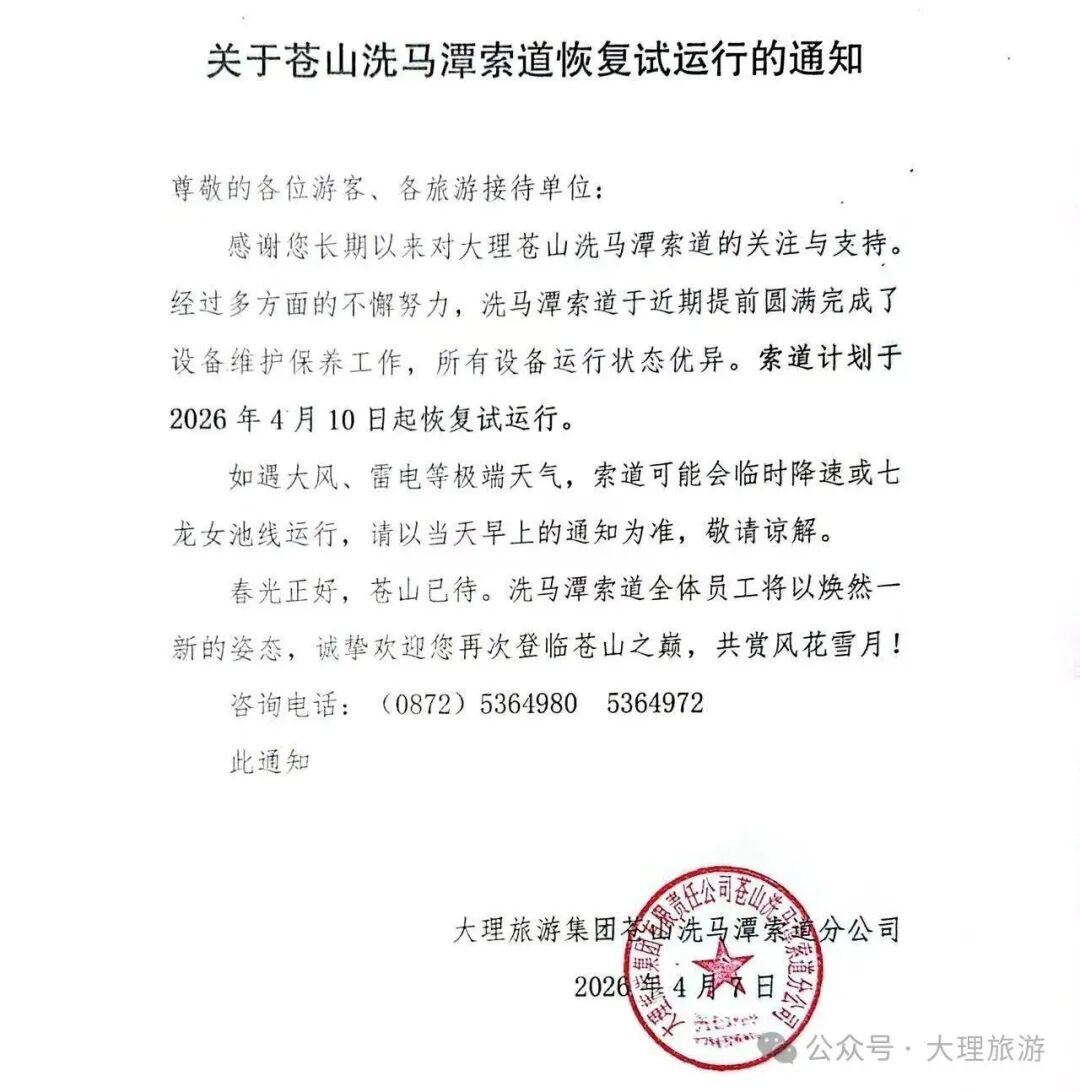 4月7日,大理旅游集团苍山洗马潭索道分公司发布通知:经过全面设备维护保养,大理苍山洗马潭索道将于4月10日起恢复试运行。