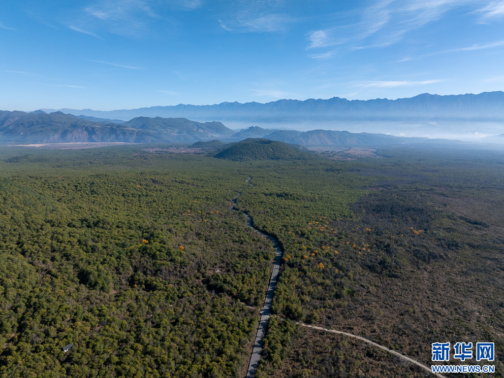 入冬后的昆明海洪湿地迎来了别样景致,水杉林褪去翠绿,换上红黄交织的冬装,与碧水相互映衬,色彩斑斓如油画。