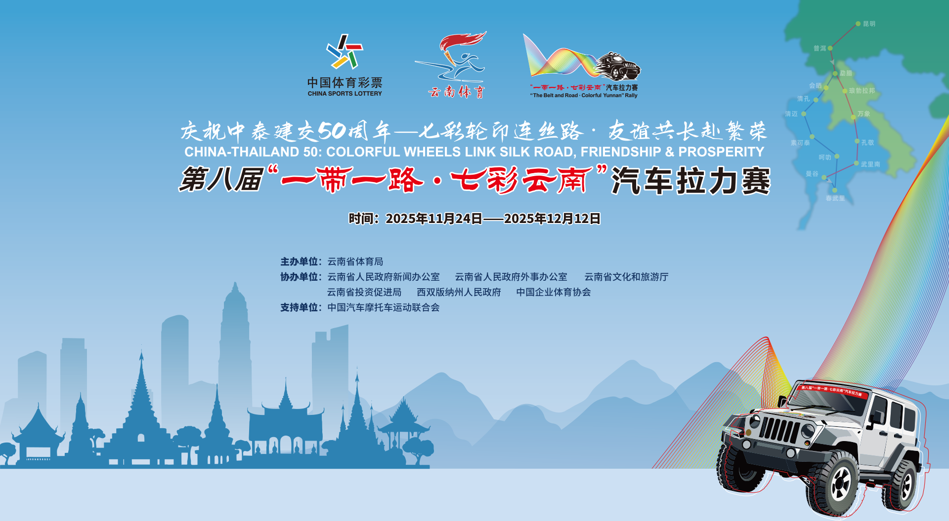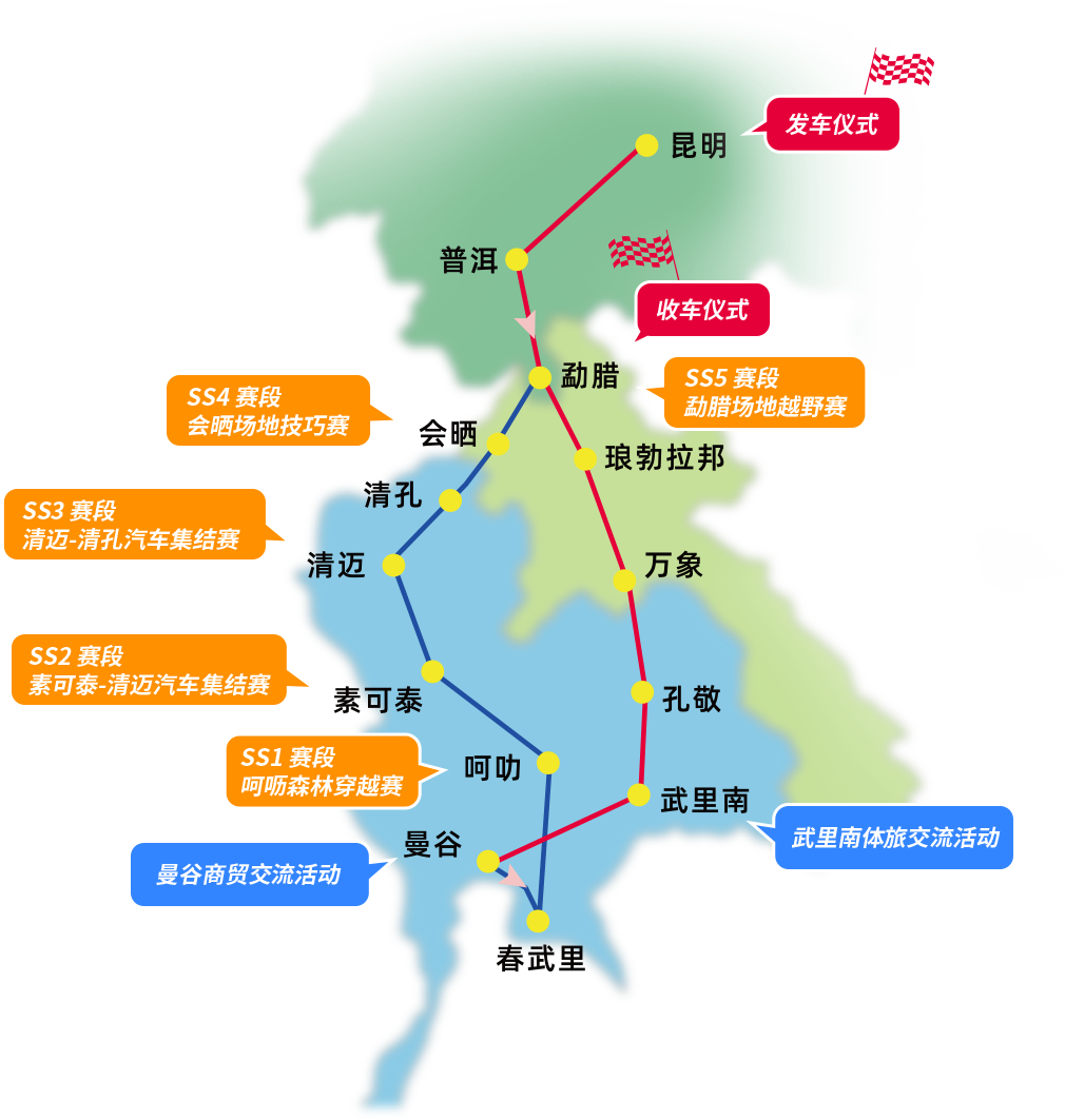2025年是中泰建交50周年,也是“一带一路”倡议提出十周年。作为深化中国与东盟国家务实合作的重要载体,“一带一路·七彩云南”汽车拉力赛迎来第八届。 本次车队将造访曼谷、春武里、呵叻等知名城市,以“体育+”融合发展模式,在呵呖、素可泰、清迈、清孔、会晒、勐腊等地开展森林穿越赛、汽车集结赛、场地技巧赛、场地越野赛等5场赛事活动及商贸交流活动,旨在深化民间友谊、促进民心相通,探索体育旅游合作新机遇。