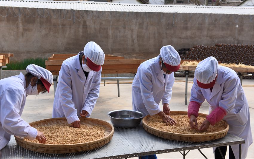 工人正在认真挑拣豆子。(吴再忠 摄)