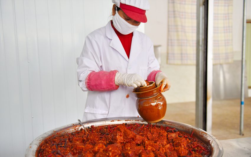 工人正在腌豆腐 。(吴再忠 摄)