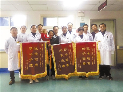 2月24日早上,患儿一家三口来到曲靖市第一人民医院,手捧三面鲜红锦旗,连声道谢,谢谢胸外科、儿外科以及儿内科医护人员的救宝大恩。