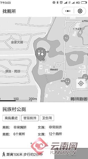 平台设置了“智慧厕所”,点击一下就可以找到离游客最近的厕所,以及厕所坑位的使用情况。