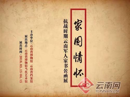 云南网讯 (记者 张蕊)3月8日,记者从云南省博物馆获悉, “家国情怀——抗战时期云南军人家书、公函展 ”将于3月15日在云南省博物馆当代艺术馆举办,此次展览将展出云南省档案馆馆藏的100余份抗战时期云南军人家书、公函、电文。