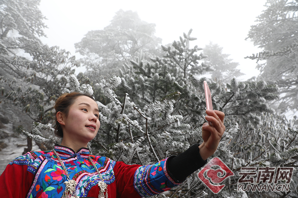 3月10日,昆明轿子山出现了春季罕见的雾凇。晶莹闪烁的“冰花”挂满枝头,吸引了不少游客观赏拍照。