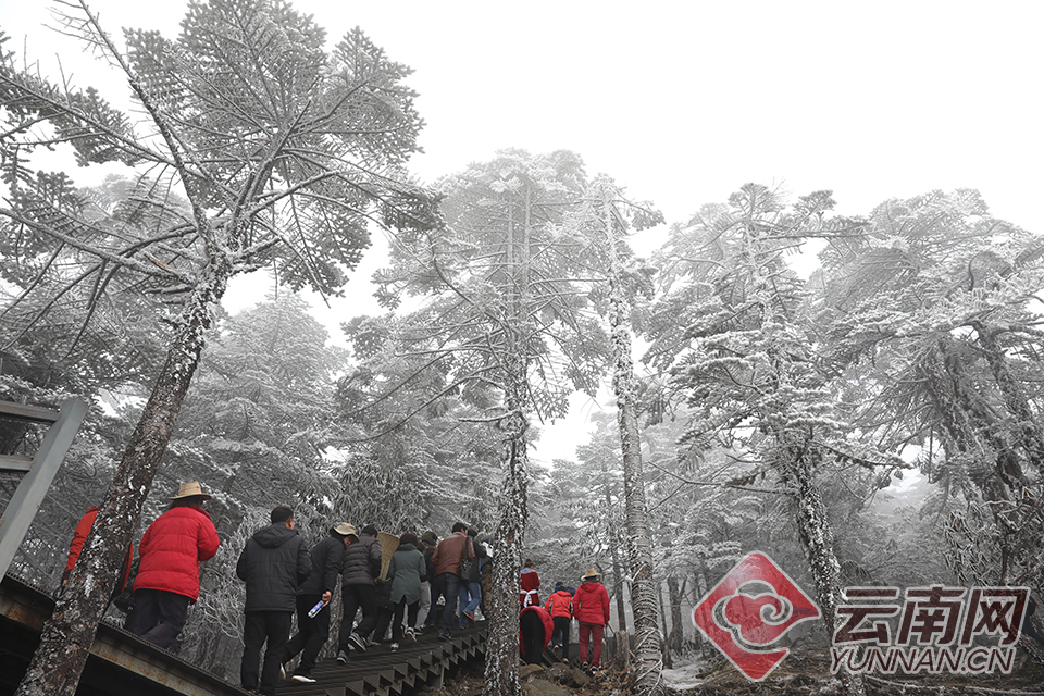 晶莹闪烁的“冰花”挂满枝头,吸引了不少游客观赏拍照。