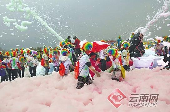 3月10日,腾冲界头15万亩油菜花海里,迎来了一次春日里的彩色狂欢,“腾冲花海节彩色跑、泡泡跑”作为本次花海节系列活动十分精彩的一环,吸引了近万人的参与。“泡泡跑”是花海节今年新增的项目,五颜六色的泡沫从空中降落,人们沉浸在泡沫梦幻世界里,彩色软萌的泡泡裹在身上,在最自然的状态下释放快乐。
