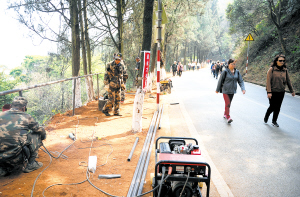为保障游客安全,在环保旅游大巴乘车点往前约200米处,西山风景区已开始进行应急道路铺设和新的人行护栏安装。“道路太窄,很多地方都清除了杂草腐殖土,重新进行了压实、填埋,填埋采用原生石材,还要在上面再铺撒一层碎石,便于游客行走。”西山景区管理局相关负责人李仲立介绍,目前,1500米防护栏安装已经完成,正在进行独具昆明文化元素的装饰。涉及西山景区主游路系统性长远性建设的2.5米宽人行登山步道正在进行前期规划、选址、设计工作,预计今年年内可以动工修建。