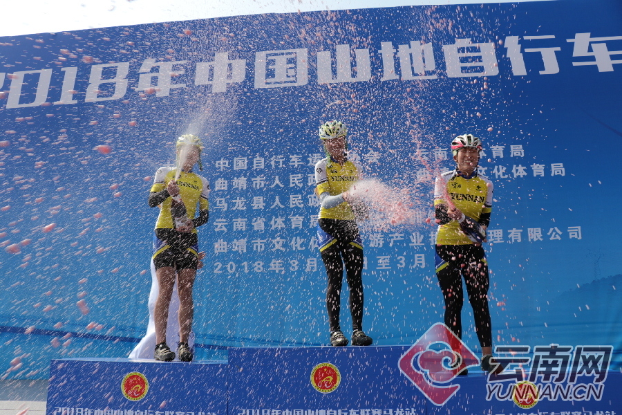 青年女子山地越野赛获奖选手开香槟庆祝。冠军伍志帆、亚军程吉丹、季军贾仁婷3朵“姐妹花”均来自云南昭通。
