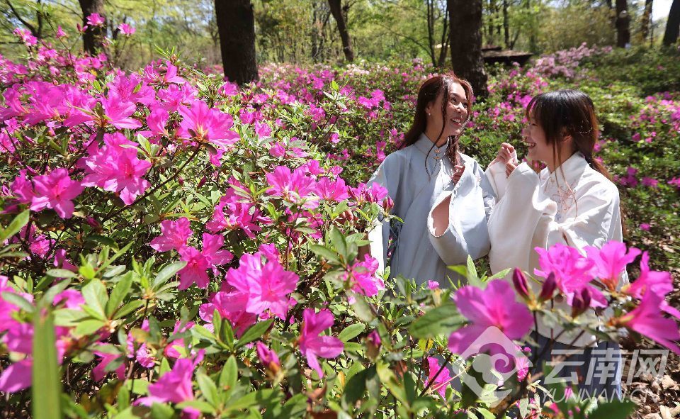 来自云南农业大学汉服社的少女在黑龙潭“杜鹃谷”开展祭花赏花游春活动