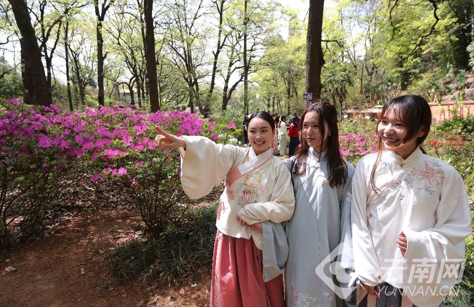 来自云南农业大学汉服社的少女在黑龙潭“杜鹃谷”开展祭花赏花游春活动