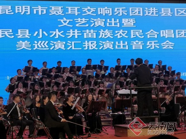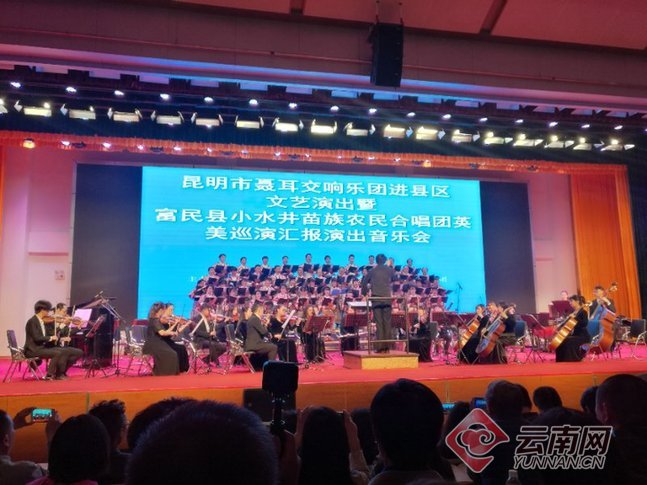 在汇报演出音乐会上,昆明聂耳交响乐团前来助兴,联合富民县小水井苗族农民合唱团,共同精心组织,合理编排了多样化演出内容,为观众带来《长街宴》《哈利路亚》《彩云追月》《拉德斯基进行曲》等中外名曲。
