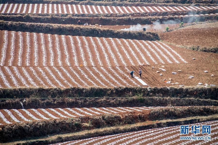 云南省昆明市东川区红土地镇农民在田间劳作(3月22日摄)。初春时节,云南省昆明市东川区红土地镇田间地头一派繁忙。农民们翻田犁地、播种施肥,开始新一年的春耕生产。新华社记者胡超摄