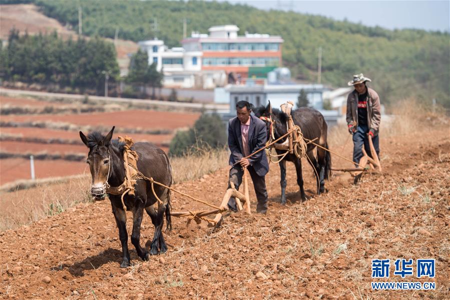 云南省昆明市东川区红土地镇农民在田间劳作(3月23日摄)。初春时节,云南省昆明市东川区红土地镇田间地头一派繁忙。农民们翻田犁地、播种施肥,开始新一年的春耕生产。新华社记者胡超摄