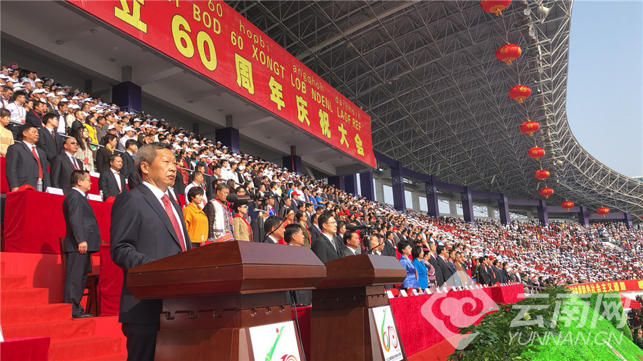 云南网讯 (记者 张蕊 李洁 贺凯 陈柏宇)60年风雨兼程,60年春华秋实;60年沧桑巨变,60年辉煌灿烂。2018年4月1日,云南文山壮族苗族自治州迎来建州60周年的喜庆时刻。盛装的文山城山水含笑,高朋满座。远道而来的四海宾朋、干部群众从四面八方汇集到文山州盘龙体育场,参加建州60周年庆祝大会,共同见证甲子文山的美好时刻,畅想壮乡苗岭的灿烂未来。