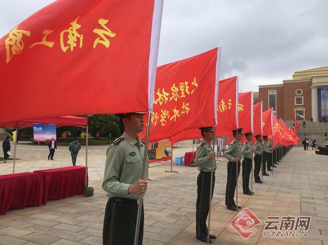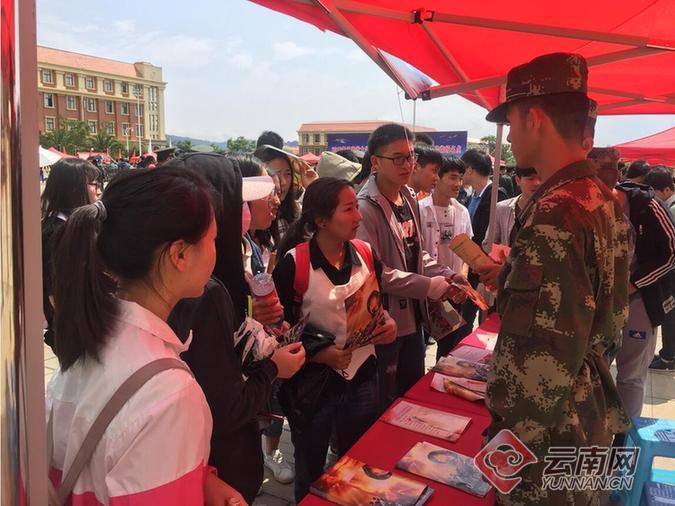 云南网讯(记者 赵岗)“我在军营等你”帅气逼人的海陆空火箭军征兵海报吸引着同学们的目光。4月27日,2018年云南省大学生征兵集中宣传报名活动在云南大学启动,10所高校共1100余名师生参加启动仪式并就征兵政策法规进行现场咨询。据悉,今年大学本科入伍提高一次性奖励标准为5000元,符合条件退役大学生士兵放宽落户限制。
