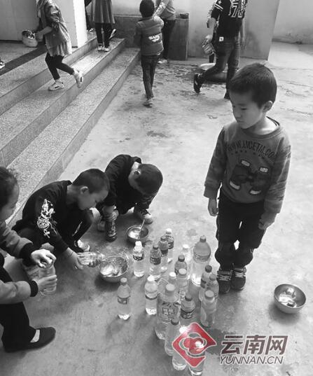 为缓解学校的用水难题,孩子们都要带水来学校,住校生用大桶带,走读生用小瓶带,教室里、寝室里,饮料瓶、玻璃瓶、大桶,五花八门,都装着学生们的生活用水。