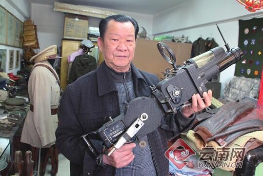 在堆满各种军功章、子弹壳和材料的书桌上,一挺“机枪”格外引人注意。实际上,这是一部用于架设在侦察机上拍摄敌情的侦察摄像机,机身徽记显示,准确名称为“八九式活动写真铳”。“这是我花1万多元才收到的。”龚康毅说。