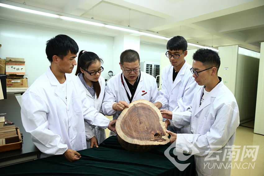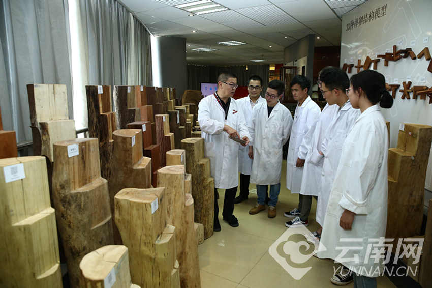图为 博士生导师邱坚教授正在给学生们介绍珍贵木材的特性。 云南网记者 张彤 摄影报道