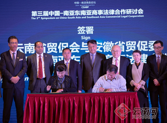 会上,中国贸促会发布了《“一带一路”国别(东帝汶、克罗地亚、新加坡、蒙古国、缅甸)法律研究成果》。省贸促会与安徽、重庆、福建、贵州、宁夏和深圳贸促会分别签署了《关于加强中国与南亚东南亚商事合作的备忘录》,并与宁夏贸促会签署了《宁夏贸促会与云南省贸促会合作备忘录》。