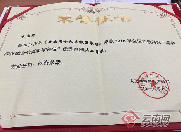 云南网讯(记者 自然)6月20日,2018(第三届)全国党报网站高峰论坛在天津举行。论坛开幕式颁发了全国党报网站“媒体深度融合的探索与突破”优秀案例奖与优秀论文奖。19个网络媒体作品获得优秀案例奖,19篇论文入围优秀论文奖。其中,云南网十九大报道策划荣获“媒体深度融合的探索与突破”优秀案例二等奖。
