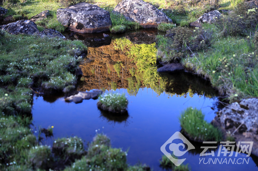 倒影在曲宗贡一水塘里的冷杉林。记者 陈飞 摄