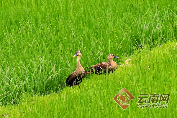 云南网讯(记者 杨之辉 通讯员 寸红亮 高金发)7月3日,一对斑嘴鸭在云南大理白族自治州鹤庆县草海镇罗伟邑村的稻田间小憩。近年来,鹤庆高度重视生态环境保护,得天独厚的生态环境使鹤庆成了鸟的天堂,不少候鸟也因此成为了鹤庆的“常住居民”,成了留鸟。近日,水雉、斑嘴鸭等多种候鸟频频出现在草海湿地一带。