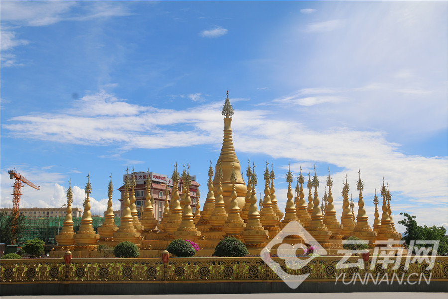 蓝天白云下的芒市芒核佛塔