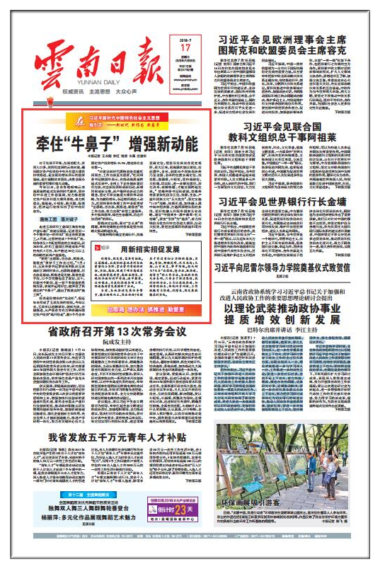 7月17日,云南日报一版头条刊发了《牵住“牛鼻子”增强新动能》长篇通讯,报道了今年以来全省增强新动能的云南响声——