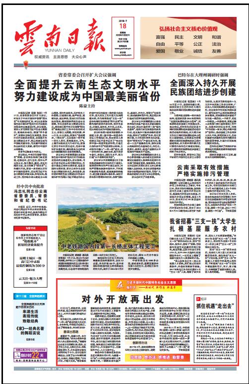 7月18日,云南日报在一版刊发了《对外开放再出发》长篇通讯,多视角报道了近年以来我省积极融入“一带一路”建设,打开大门,拥抱世界,展示了对外开放的云南奔跑——