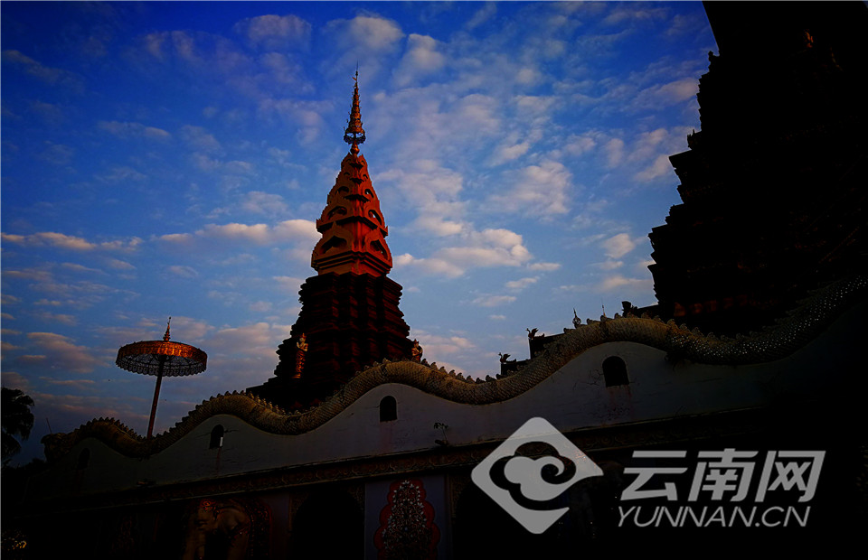 作者:王国兴。作品拍摄于2018年4月9日早晨,天边五彩霞光与西双版纳告庄大金塔相映成辉,美不胜收。