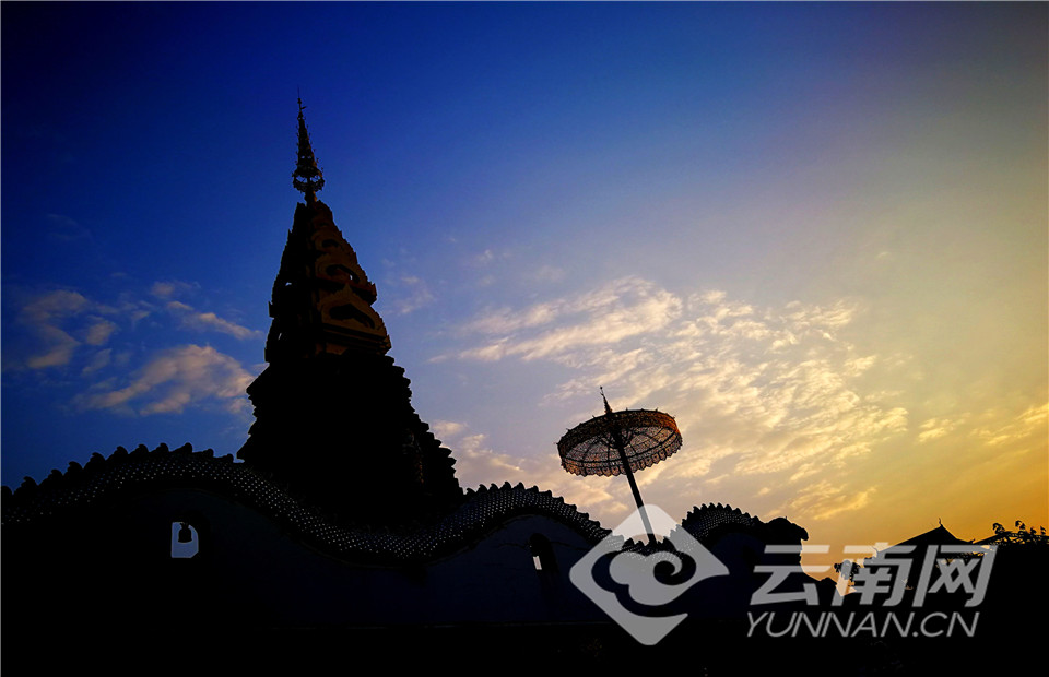天边五彩霞光与西双版纳告庄大金塔相映成辉,美不胜收。