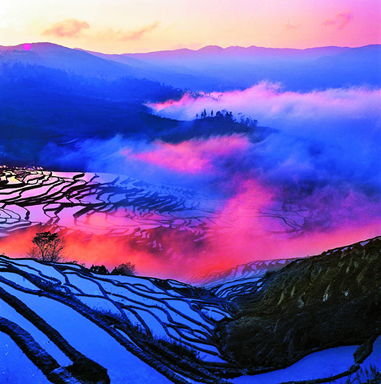 【紫笼烟暮】紫霞中的哈尼梯田。神秘而高贵的紫色,在中国的道教中,紫色成为上天仙境的色彩。紫色代表胆识与勇气,也代表隐晦、忧郁、高贵、神秘、深沉、成熟、浪漫。在中国传统里,紫色是王者的颜色,如北京故宫又称为“紫禁城”,亦有所谓“紫气东来”的意象。
