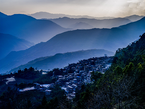 【远山如黛】元阳县攀枝花乡阿勐控村,远处黛色的群山隐映,如诗如画。古人有诗曰:“晓雾轻绡卷,岚光抹黛新。”青黛对中国古代文人而言,是一种高洁的颜色。青山也是古诗中常见的意象。唐人有诗云:“青山与白云,方展我怀抱。”青黛在五行中属木,是东方的颜色。