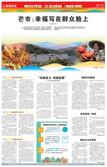 近年来,芒市牢牢抓住“扶持谁、谁来扶、怎么扶”3个关键,通过住房、产业、教育、医疗等帮扶举措,补齐脱贫“最后一公里”短板,群众收入大幅上升,脱贫攻坚取得明显成效。