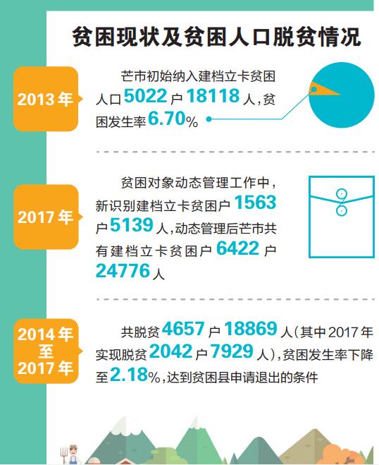 芒市聚焦“两不愁、三保障”总体目标,举全市之力推动脱贫攻坚工作。11名市委常委、44名处级领导分别挂包11个乡镇和36个贫困村,广大党员干部和各族群众全身心投入脱贫攻坚当中。通过精准识别,采取“一户一策”,扶到点上,帮到根上。群众通过帮扶,增强了信心,激发出了内生动力,为美好生活不等不靠,撸起袖子加油干。2017年,实现1个贫困乡、24个贫困村脱贫出列,18869人建档立卡贫困人口脱贫,贫困发生率由6.70%下降至2.18%。