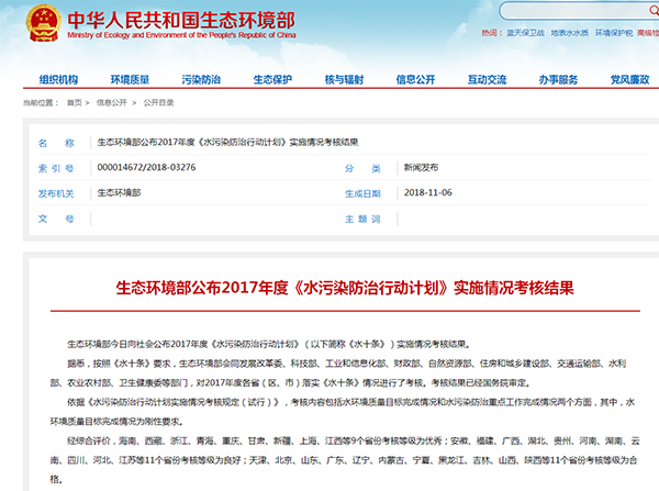 据悉,按照“水十条”要求,生态环境部会同发展改革委、科技部、工业和信息化部、财政部、自然资源部、住房和城乡建设部、交通运输部、水利部、农业农村部、卫生健康委等部门,对2017年度各省(区、市)落实“水十条”情况进行了考核。考核结果已经国务院审定。