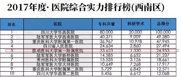 云南网讯 11月17日,一年一度复旦版《2017年度中国医院排行榜》和《2017年度中国医院专科声誉和综合排行榜》在上海发布。这是连续第九年发布“复旦版医院排行榜”。该榜单已成为中国医院学科建设的一个标杆,也常被作为大众疑难杂症寻找心中好医院的重要参考。此次榜单,云南只有一家医院即昆明医科大学第一附属医院(云大医院)上榜,综合实力排在西南区第5名。