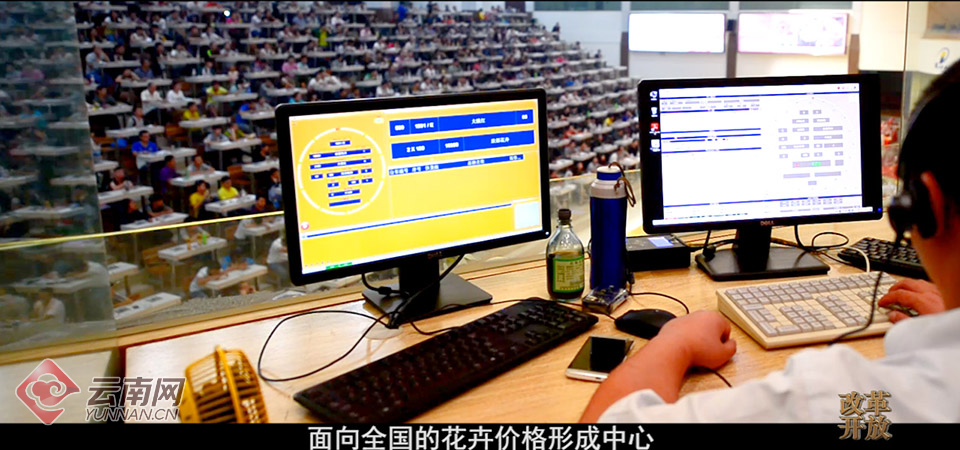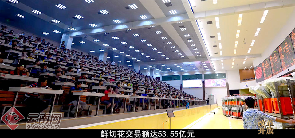 下午15时,昆明国际花卉拍卖交易中心的拍卖正式开始,9口交易大钟,900个交易席位,每5秒完成一笔交易,平均日交易量1650万枝,交易额1294万元,连续10余年年交易量、交易额、现金量、人流量和出口额全国第一。