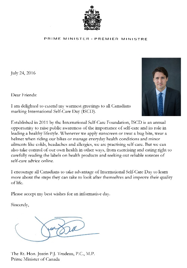 加拿大总理也于2016年7月24日给加拿大公民写公开信支持国际自我保健日。