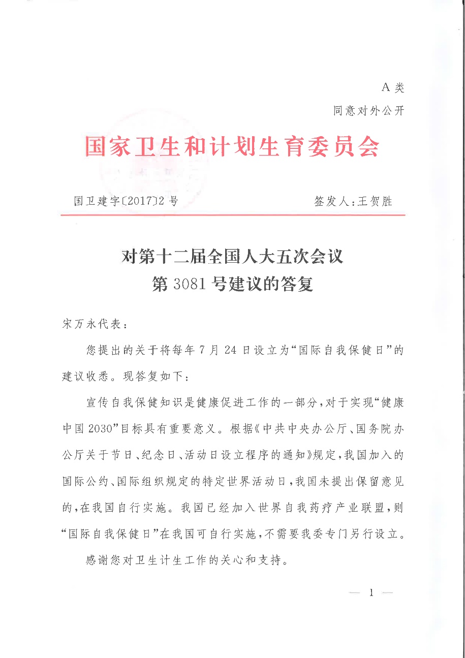 2017年,原国家卫计委“国卫健字(2017)2号”文认可了国际自我保健日,肯定宣传自我保健知识是健康促进工作的一部分,对于实现“健康中国2030”目标具有重要意义。