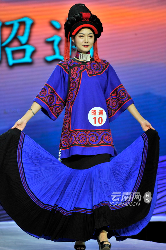 昭通市参赛队的汉族创意服饰运用了毛毡及红毡制作技艺,将红毡中“鹿望金钟”、“松鹤同寿”等传统图案、红绿色为主调的色彩及传统披毡的形制样式等元素运用其中。白苗创意服饰在图案的绣制及色彩的运用上进行了创新,再加以现代装饰物。回族创意服饰既运用了伊斯兰特色的图案,又将现代婚礼服饰的样式及色彩融合进去。