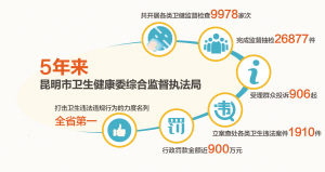 5年来,昆明市卫生健康委综合监督执法局共开展各类卫生监督检查9978家次,完成监督抽检26877件,受理群众投诉906起,立案查处各类卫生违法案件1910件,行政罚款金额近900万元,打击卫生违法违规行为的力度名列全省第一。