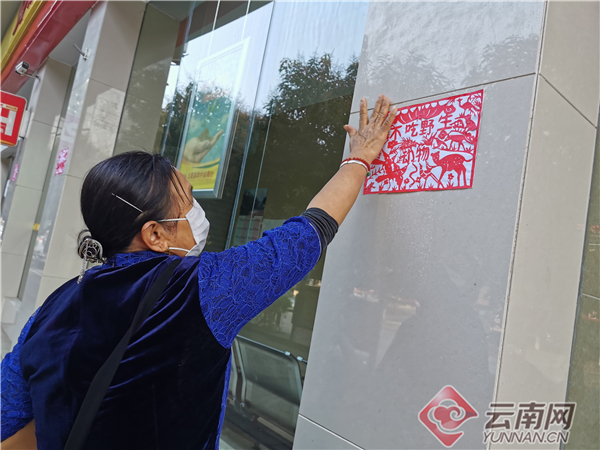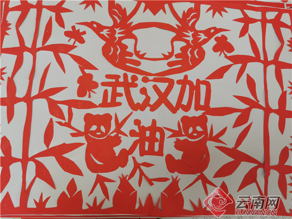 最近几天,“描花”每天都创作宣传标语剪纸,将做好的标语带到大街上张贴,呼吁群众做好防疫,戴好口罩,减少串门。《戴口罩》《不吃野生动物》《武汉加油》……一系列用于防疫宣传的剪纸作品精美、新颖,引人注目。