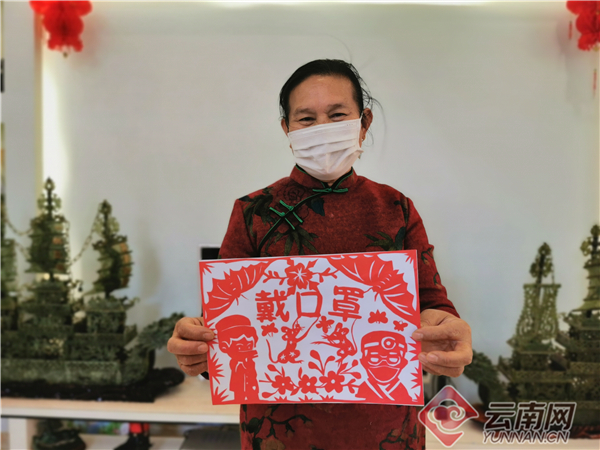 “这幅作品是结合当前形势创作的,有了医护人员的守护,大家齐心做好防护,就一定会有春暖花开的时候。”醒目的红色剪纸上,“戴口罩”三个字异常醒目,医护人员被花草包围着,共同构筑起创作者“描花”对当前疫情的关心和美好期待。