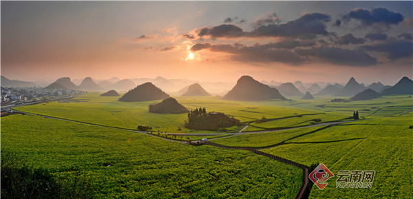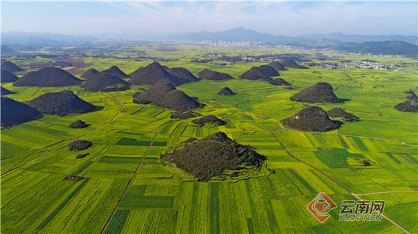 2月底,随着气温回升,天气转暖,云南省罗平县百万亩油菜花次第绽放,迎来盛花期。登高远望,大地流金,香气四溢的油菜花海依山傍水、层层叠叠,与连绵的青山、蜿蜒的溪水、漂亮的民居以及田间劳作的人们相映成趣。