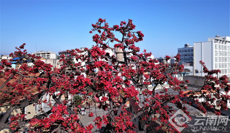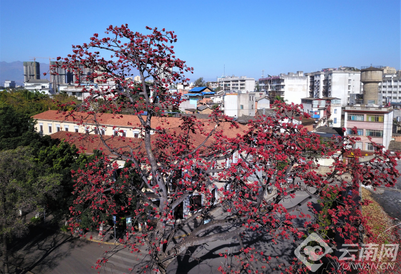 【高清组图】云南蒙自:百年木棉花满树 满树红花春意浓